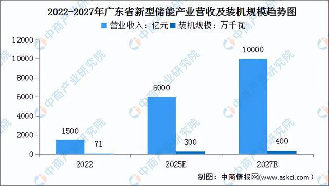儲能是新型電力系統(tǒng)的重要組成部分,在“雙碳”目標下,廣東省新型儲能產(chǎn)業(yè)具有良好發(fā)展前景。數(shù)據(jù)顯示,2022年廣東省新型儲能產(chǎn)業(yè)營業(yè)收入約1500億元,裝機規(guī)模達到71萬千瓦。預計到2025年,廣東省新型儲能產(chǎn)業(yè)營業(yè)收入達到6000億元,年均增長50%以上,裝機規(guī)模達到300萬千瓦;到2027年,廣東省新型儲能產(chǎn)業(yè)營業(yè)收入達到1萬億元,裝機規(guī)模達到400萬千瓦。