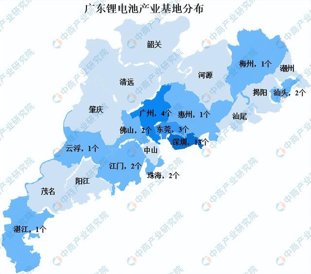 廣東是國內重要的鋰電池基地,主要集中分布在珠三角地區(qū)。其中,深圳13個,廣州4個,東莞3個,佛山、江門、汕頭、珠海各2個,惠州、梅州、云浮、湛江各1個。