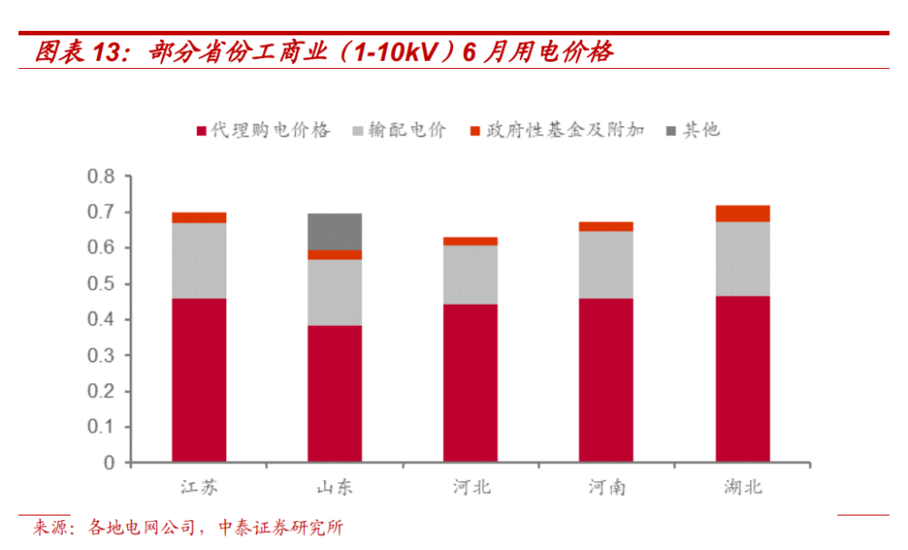 此前,關(guān)于儲能充電是否需承擔(dān)輸配電價等費用,各地沒有明確統(tǒng)一的標(biāo)準(zhǔn)?!锻ㄖ诽貏e指出,獨立儲能電站向電網(wǎng)送電的,其相應(yīng)充電電量不承擔(dān)輸配電價和政府性基金及附加,這一規(guī)定將大幅降低儲能充電成本。我們統(tǒng)計了部分省份2022年6月代理購電的用電價格,輸配電價和政府性基金及附加合計占用電價格的比例超過30%,以江蘇省為例,代理購電價格、輸配電價、政府性基金及附加分別為0.4594、0.2110、0.0294 元/kWh,輸配電價及政府性基金占用電價格比例為 34.35%。若儲能充電需支付這兩部分費用,將大幅提高充電成本,因此這一規(guī)定將明確儲能項目邊界條件,保障儲能合理收益,提高儲能投資意愿。