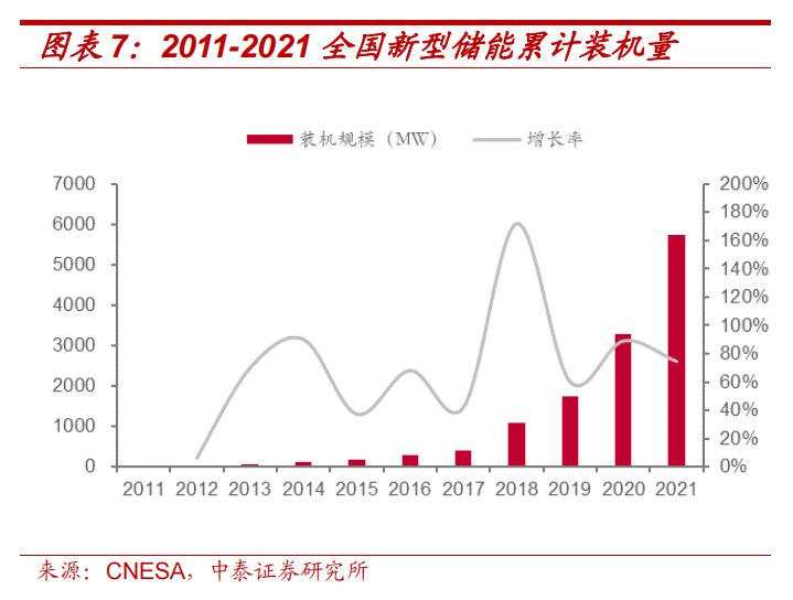 2021年起,各省密集發(fā)布新能源項目配套儲能政策,配臵比例主要在 10%-20%區(qū)間,配臵時長1-2小時,推動我國電化學(xué)儲能高速增長。根據(jù)《2022儲能產(chǎn)業(yè)研究報告》,2021年我國新能源配儲占電化學(xué)儲能應(yīng)用的45.40%,我國電化學(xué)儲能主要應(yīng)用在電源側(cè)和電網(wǎng)側(cè)來支持風(fēng)光新能源消納和新型電力系統(tǒng)建設(shè)。