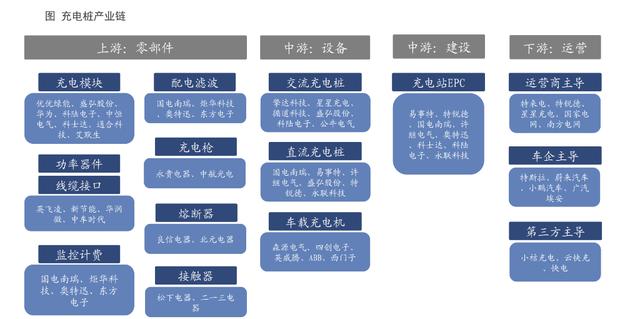 再來(lái)拆下充電樁的產(chǎn)業(yè)鏈,充電樁的產(chǎn)業(yè)鏈很簡(jiǎn)單,上游是零部件、中游是設(shè)備加工制造,再到下游運(yùn)營(yíng)環(huán)節(jié)。
