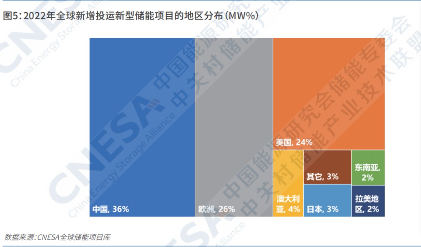近年來新增投運(yùn)新型儲能項(xiàng)目地區(qū)主要在美國、歐洲和中國,合計(jì)占全球市場高達(dá)80%。