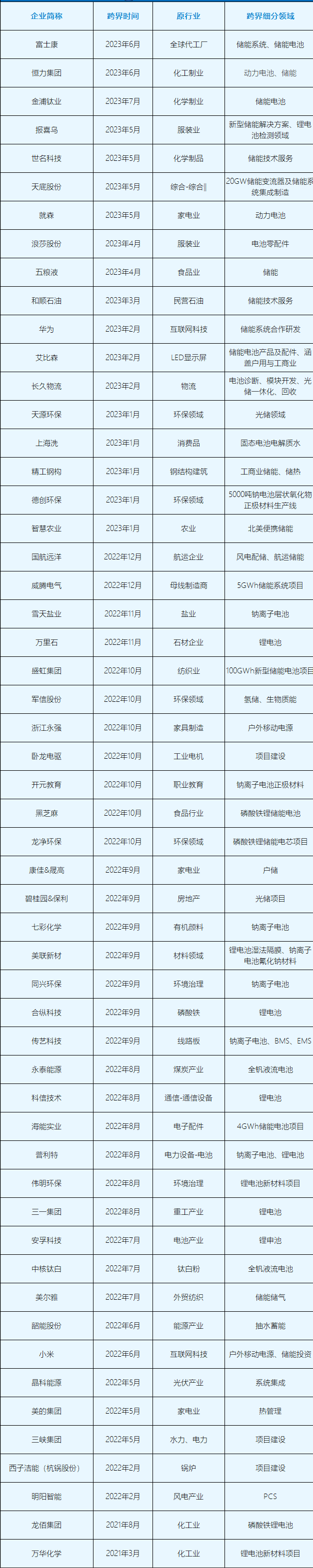 2022年以來,不少來自互聯(lián)網(wǎng)、化工、酒業(yè)、房地產(chǎn)、紡織、游戲、珠寶、家電、食品等領(lǐng)域的企業(yè)爭相加碼儲能。據(jù)小編統(tǒng)計,2022年至今,國內(nèi)總計有54家知名上市企業(yè)先后公布儲能領(lǐng)域轉(zhuǎn)型或投資計劃。