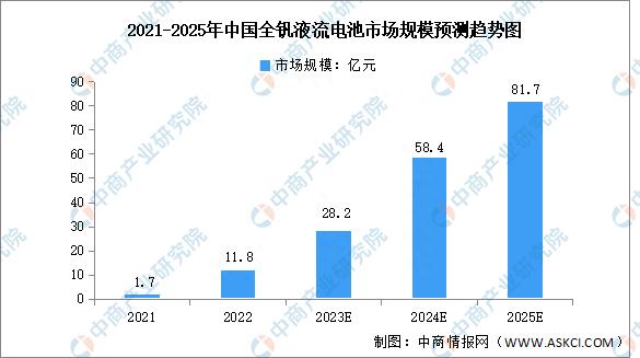 全釩液流電池的市場(chǎng)空間主要來自于儲(chǔ)能需求的增長(zhǎng)以及自身滲透率的提升,隨著技術(shù)的進(jìn)步及生產(chǎn)成本的降低,全釩液流電池市場(chǎng)空間將逐步擴(kuò)大。數(shù)據(jù)顯示,2022年全釩液流電池市場(chǎng)規(guī)模約11.8億元,中商產(chǎn)業(yè)研究院分析師預(yù)測(cè),2023年我國(guó)全釩液流電池市場(chǎng)規(guī)模將達(dá)28.2億元,預(yù)計(jì)2025年將增至81.7億元,2021-2025年復(fù)合年均增長(zhǎng)率達(dá)163.3%。
