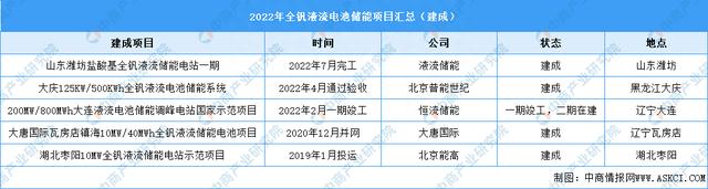 全釩液流電池具有響應(yīng)快、安全環(huán)保、壽命長(zhǎng)、規(guī)模大等特點(diǎn),適合長(zhǎng)時(shí)儲(chǔ)能,市場(chǎng)發(fā)展空間廣闊。2022年,我國(guó)全釩液流電池儲(chǔ)能項(xiàng)目中,建成項(xiàng)目5個(gè),在建項(xiàng)目14個(gè)。