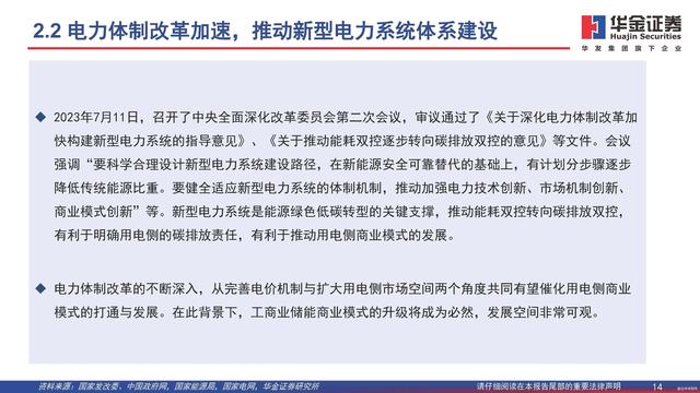 2023年7月11日,召開了中央全面深化改革委員會第二次會議,審議通過了《關(guān)于深化電力體制改革加快構(gòu)建新型電力系統(tǒng)的指導(dǎo)意見》、《關(guān)于推動能耗雙控逐步轉(zhuǎn)向碳排放雙控的意見》等文件。會議強調(diào)“要科學(xué)合理設(shè)計新型電力系統(tǒng)建設(shè)路徑,在新能源安全可靠替代的基礎(chǔ)上,有計劃分步驟逐步降低傳統(tǒng)能源比重。要健全適應(yīng)新型電力系統(tǒng)的體制機制,推動加強電力技術(shù)創(chuàng)新、市場機制創(chuàng)新、商業(yè)模式創(chuàng)新”等。新型電力系統(tǒng)是能源綠色低碳轉(zhuǎn)型的關(guān)鍵支撐,推動能耗雙控轉(zhuǎn)向碳排放雙控,有利于明確用電側(cè)的碳排放責任,有利于推動用電側(cè)商業(yè)模式的發(fā)展。