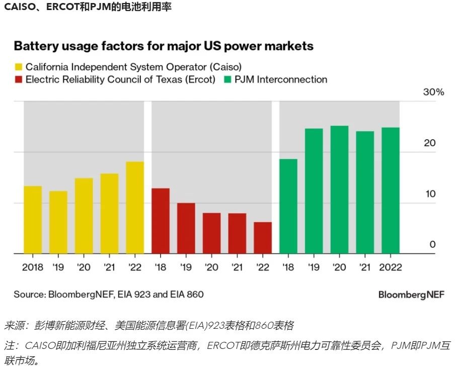 電池利用率受電池使用情況影響,也因地區(qū)而異。對(duì)于加利福尼亞州獨(dú)立系統(tǒng)運(yùn)營(yíng)商(CAISO),由于市場(chǎng)多元化的商業(yè)模式,利用率波動(dòng)很大;而在德克薩斯州,對(duì)于電力可靠性委員會(huì)(ERCOT),電池主要提供調(diào)頻服務(wù),因此電池平均利用率較低;在PJM互聯(lián)市場(chǎng)中,電池也主要用于調(diào)頻,但由于市場(chǎng)對(duì)電池的循環(huán)需求高,利用率往往相當(dāng)之高。