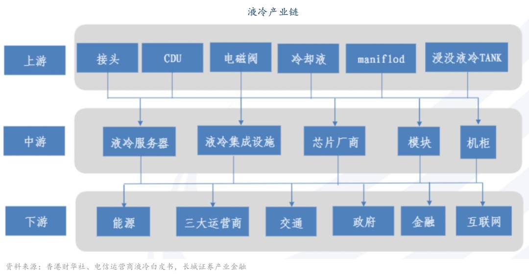 相比于風(fēng)冷技術(shù),液冷具有更高的冷卻效率和成長性。根據(jù)中國證券報(bào)研究,產(chǎn)品零部件提供商、液冷服務(wù)器提供商及算力使用者貫穿整個(gè)液冷產(chǎn)業(yè)生態(tài)的上、中、下游。我國液冷技術(shù)起步稍晚于國外,但起步后發(fā)展迅速,后期與國外發(fā)展進(jìn)程基本同步,并且在液冷規(guī)模試點(diǎn)應(yīng)用方面積累了豐富經(jīng)驗(yàn)。