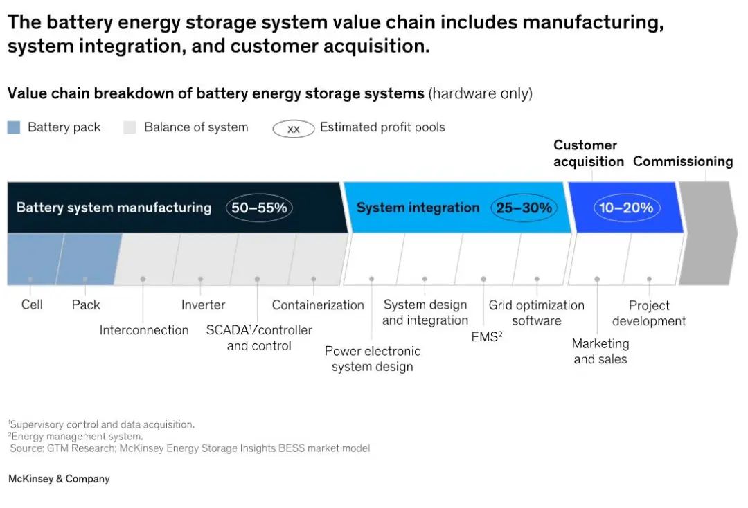 然后是系統(tǒng)集成活動,包括能源管理系統(tǒng)和其他軟件的總體設(shè)計和開發(fā),以使電化學(xué)儲能更加靈活和有用。預(yù)計這些集成商將獲得另外25%至30%的利潤。最后,10%到20%的利潤池與銷售實體、項目開發(fā)組織、其他客戶獲取活動和調(diào)試相關(guān)。
