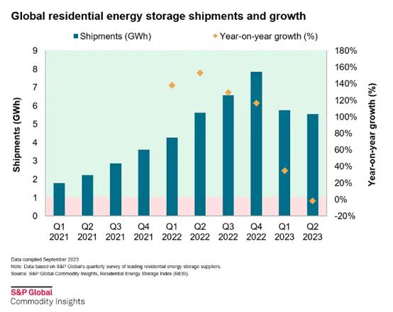 根據(jù)S&P Global Commodity Insights數(shù)據(jù),2023年Q2,全球戶用儲(chǔ)能出貨量較Q1下降了2%,這是戶儲(chǔ)有統(tǒng)計(jì)數(shù)據(jù)以來的第一次。