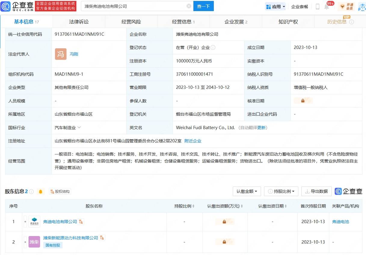 近日,濰柴弗迪電池有限公司成立,法定代表人為馮剛,注冊(cè)資本10億,經(jīng)營(yíng)范圍含電池制造,電池銷售,技術(shù)服務(wù)、技術(shù)開發(fā)、技術(shù)咨詢、技術(shù)交流、技術(shù)轉(zhuǎn)讓、技術(shù)推廣,新能源汽車廢舊動(dòng)力蓄電池回收及梯次利用等。