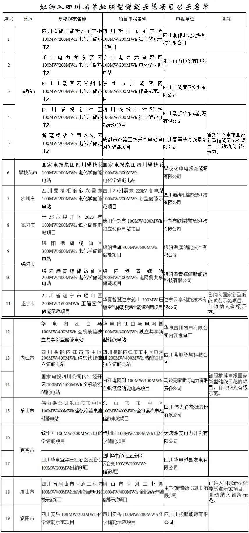 3月24日,四川發(fā)改委公布了《擬納入四川省首批新型儲(chǔ)能示范項(xiàng)目公示名單》,共有19個(gè)項(xiàng)目,總規(guī)模2.4GW/7.1GWh。
