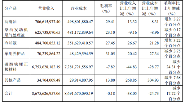 但有兩項(xiàng)業(yè)務(wù)收入同比下滑,其中柴油發(fā)動(dòng)機(jī)尾氣處理液收入同比下降9.16%至6.26億元;磷酸鐵鋰正極材料產(chǎn)品實(shí)現(xiàn)營(yíng)收67.54億元,同比下降44.83%。可以說(shuō)收入占比達(dá)78%的磷酸鐵鋰正極材料極大地拉低了整體收入水平。