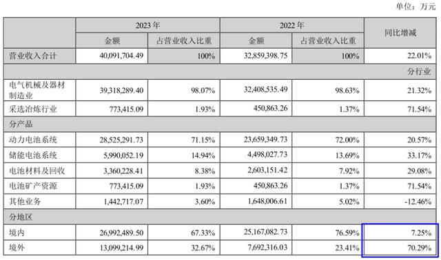 從銷售區(qū)域來看,海外市場已經(jīng)成為推動寧德時代營收增長的關(guān)鍵。據(jù)公司年報(bào)數(shù)據(jù)顯示,2023年全年,寧德時代境外市場實(shí)現(xiàn)銷售收入1309.92億元,同比增長70.29%,收入占比為32.67%,同比提升了9.16個百分點(diǎn),毛利率為25.19%。對比看,公司境內(nèi)市場銷售收入為2699.25億元,同比增長7.25%,銷售毛利率為21.8%。