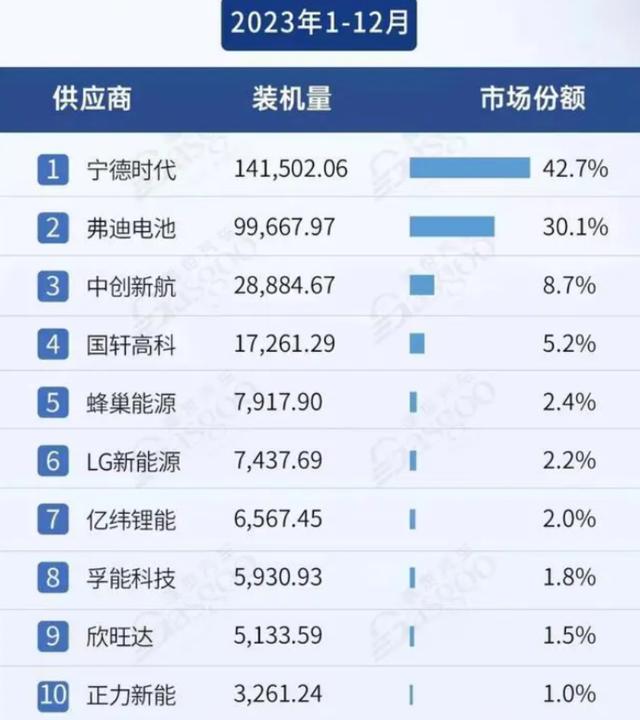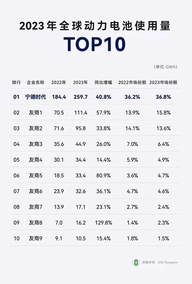 事實(shí)上,寧德時代評級之所以能夠獲得上調(diào),與其市場份額的持續(xù)提升不無關(guān)系。《2023年全球動力電池使用數(shù)據(jù)》顯示,2023年寧德時代動力電池使用量達(dá)259.7GWh,相較2022年增長40.8%,市場占有率高達(dá)36.8%,穩(wěn)居世界第一,比第二名高出近21個百分點(diǎn)。