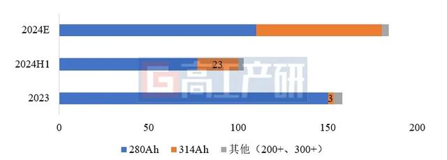 2023年下半年以來,企業(yè)加速切換314Ah產(chǎn)線,部分企業(yè)已將280Ah作為庫存拋售。截至2024年上半年,314Ah有效產(chǎn)能已達(dá)40GWh。