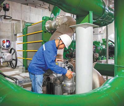 工作人員在壓縮空氣儲能電站調(diào)試壓縮機閉式冷卻水系統(tǒng)閥門。 丁小偉攝