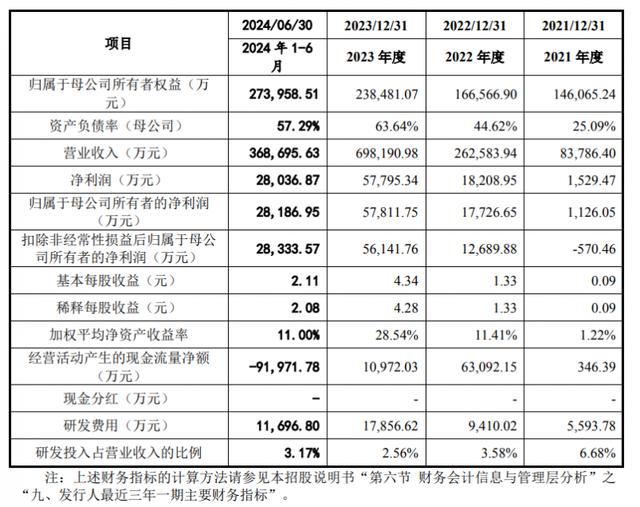 2021年-2024年上半年,其向前五名客戶合計的銷售額占營業(yè)收入的比例分別為78.16%、83.70%、74.37%和58.43%。