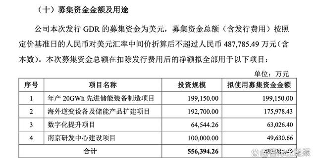 此次發(fā)行GDR的募集資金為美元,募集資金總額(含發(fā)行費(fèi)用)折算后不超過(guò)人民幣48.78億元。所募資金在扣除發(fā)行費(fèi)用后,將全部用于年產(chǎn)20GWh先進(jìn)儲(chǔ)能裝備制造項(xiàng)目、海外逆變?cè)O(shè)備及儲(chǔ)能產(chǎn)品擴(kuò)建項(xiàng)目、數(shù)字化提升項(xiàng)目以及南京研發(fā)中心建設(shè)項(xiàng)目。