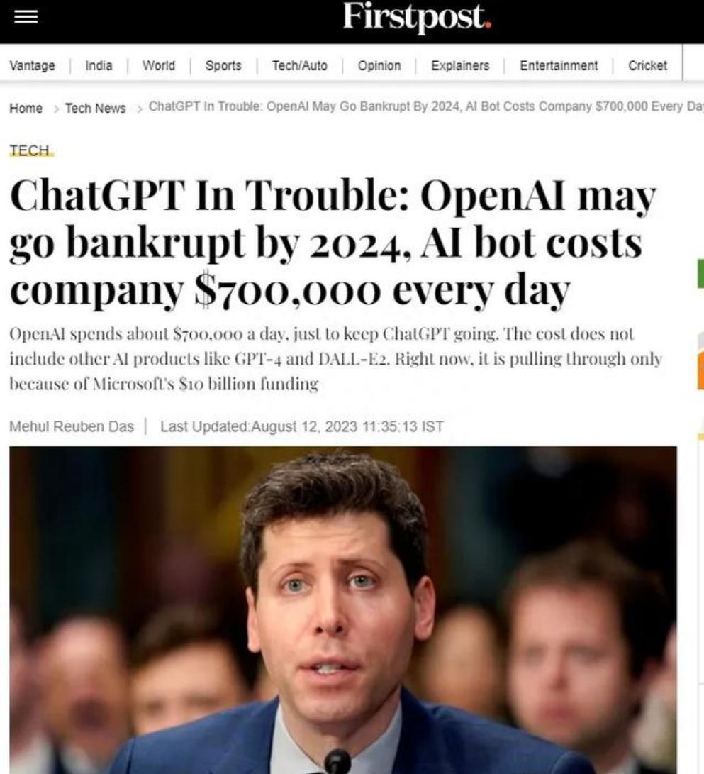 2023 年 1 月,投資銀行摩根士丹利的一份分析報告稱,在 ChatGPT 上回復(fù)的成本約為谷歌搜索查詢平均成本的 6 倍至 28 倍。根據(jù)摩根士丹利最近的分析,谷歌去年 3.3 萬億次搜索的平均成本約為每次 0.2 美分。因此可以看出,ChatGPT 聊天回復(fù)成本為 1.2 美分至 5.6 美分之間。根據(jù)公開的信息顯示,GPT4 一次完整的訓(xùn)練大約需要 6000 多萬美元,報道所說的 ChatGPT 每天耗費 70 萬美元,應(yīng)該主要是數(shù)據(jù)中心的日常算力消耗。僅在 2022 年 OpenAI 的財務(wù)凈虧損就高達 5.45 億美元。甚至有印度媒體聲稱 OpenAI 有在 2024 年倒閉的可能。