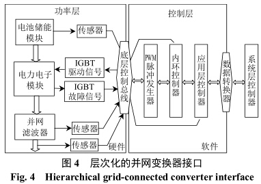 參照通信系統(tǒng)的開放系統(tǒng)互連(open system in-terconnection,OSI)模型,并網(wǎng)變換器分層控制功能示意圖如圖3所示。圖3中:θ為電網(wǎng)電壓相位;SPLL(software phase loop)為軟鎖相環(huán)[11];IGBT(insulated gate bipolar transistor)為絕緣柵雙極型晶體管。硬件層控制模塊由FPGA完成;應(yīng)用層控制模塊由DSP完成算法運(yùn)算,提高了系統(tǒng)靈活性;系統(tǒng)層控制由上位機(jī)完成,可以實現(xiàn)多個儲能系統(tǒng)的大規(guī)模調(diào)度。層次化的并網(wǎng)變換器接口如圖4所示。