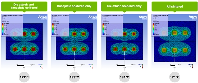 有關(guān)于同工況下,使用芯片下及系統(tǒng)級(jí)燒結(jié)銀連接方案,將會(huì)比單單在芯片下使用燒結(jié)銀方案,系統(tǒng)溫度將下降約10℃。比全軟焊料解決方案下降更多,能達(dá)到約20℃的顯著效果。