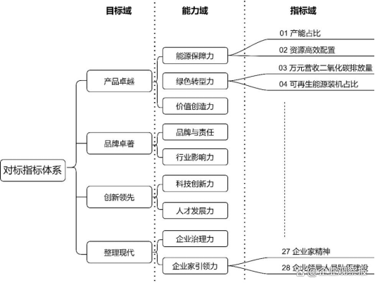 “一個(gè)體系”,即構(gòu)建業(yè)績(jī)維度和管理要素并重的,滿足全集團(tuán)統(tǒng)一、多級(jí)貫通的世界一流企業(yè)對(duì)標(biāo)指標(biāo)體系。對(duì)標(biāo)指標(biāo)體系重點(diǎn)體現(xiàn)“產(chǎn)品卓越、品牌卓著、創(chuàng)新領(lǐng)先、治理現(xiàn)代”十六字標(biāo)準(zhǔn)和“創(chuàng)新力、競(jìng)爭(zhēng)力、治理力、影響力、引領(lǐng)力”五力要求,結(jié)合集團(tuán)未來(lái)發(fā)展方向、定位和目標(biāo)等進(jìn)行選擇和設(shè)置,通過(guò)分級(jí)分類建立集團(tuán)各級(jí)子公司的對(duì)標(biāo)指標(biāo)體系,形成涵蓋集團(tuán)公司綜合對(duì)比指標(biāo)體系及子分公司等若干產(chǎn)業(yè)特色共性指標(biāo),實(shí)現(xiàn)傳導(dǎo)壓力、激發(fā)動(dòng)力,進(jìn)而增強(qiáng)創(chuàng)建世界一流企業(yè)行動(dòng)的系統(tǒng)性、針對(duì)性和有效性。