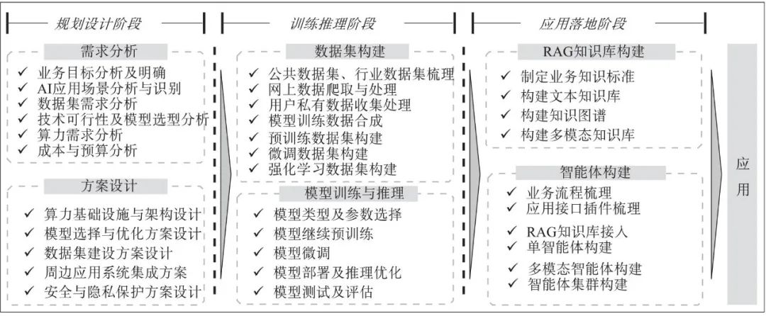 AI工程化整體流程涵蓋規(guī)劃設(shè)計(jì)、訓(xùn)練推理和應(yīng)用落地三個(gè)階段(如圖1所示)。在規(guī)劃設(shè)計(jì)階段,首要關(guān)注企業(yè)戰(zhàn)略和業(yè)務(wù)目標(biāo)選擇,圍繞全鏈路規(guī)劃展開需求分析,包括業(yè)務(wù)目標(biāo)分析、AI應(yīng)用場景分析、數(shù)據(jù)需求分析、技術(shù)可行性及算力需求分析等。同時(shí),基于AI原生(AI Native)的系統(tǒng)方案設(shè)計(jì)強(qiáng)調(diào)業(yè)務(wù)需求理解、數(shù)據(jù)治理、模型優(yōu)化與部署以及監(jiān)控與運(yùn)維的重要性,遵循以AI為核心、數(shù)據(jù)優(yōu)先、持續(xù)學(xué)習(xí)與迭代、自適應(yīng)與個(gè)性化等設(shè)計(jì)原則。在訓(xùn)練推理階段,針對通用AI大模型存在的“有幻覺、成本高”等問題,行業(yè)、領(lǐng)域AI大模型成為落地“人工智能+”的有效手段,企業(yè)需根據(jù)自身情況選擇開發(fā)L1行業(yè)模型或L2場景模型,并依托成熟工具平臺(tái)支撐數(shù)據(jù)集工程交付能力,同時(shí)注重模型體系設(shè)計(jì)與選擇、訓(xùn)練及調(diào)優(yōu)以及推理優(yōu)化及評估等關(guān)鍵環(huán)節(jié)。在應(yīng)用落地階段,智能體應(yīng)用為AI大模型應(yīng)用落地提供技術(shù)化手段,通過構(gòu)建檢索增強(qiáng)生成(Retrieval-Augmented Generation,RAG)知識(shí)庫解決私域數(shù)據(jù)利用及實(shí)時(shí)性問題,同時(shí)智能體構(gòu)建的技術(shù)方法手段多樣,包括通過開發(fā)框架直接開發(fā)和基于智能體使能平臺(tái)構(gòu)建應(yīng)用,且智能體全生命周期可觀測體系和集群全生命周期管理體系為企業(yè)AI應(yīng)用的穩(wěn)定運(yùn)行和持續(xù)優(yōu)化提供保障。