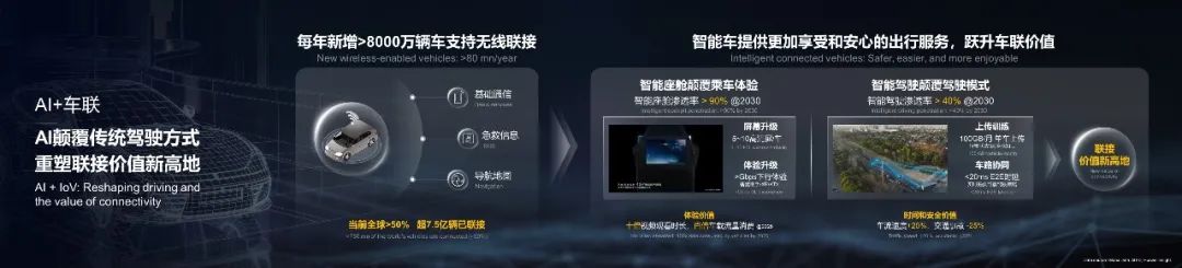 第二,智能網(wǎng)聯(lián)汽車將顛覆傳統(tǒng)駕駛方式,提供更加愉悅和安心的出行服務(wù)。智能座艙,將顛覆人們的乘車體驗(yàn)。Gbps網(wǎng)絡(luò)體驗(yàn)支持智慧助手、多屏觀看和XR應(yīng)用等需求,使車輛成為集休閑、娛樂和工作于一體的'移動第三空間'。智能駕駛,將顛覆傳統(tǒng)的駕駛模式。通過每月百GB的數(shù)據(jù)上傳訓(xùn)練,智駕系統(tǒng)不斷提高模型準(zhǔn)確性,精準(zhǔn)識別和響應(yīng)多樣化交通環(huán)境;同時,基于毫秒級的車路協(xié)同,將實(shí)時提供穩(wěn)定可靠的駕駛策略。智能網(wǎng)聯(lián)汽車將兌現(xiàn)車聯(lián)體驗(yàn)價值,進(jìn)一步帶來時間價值和安全價值,重塑聯(lián)接價值的新高地。