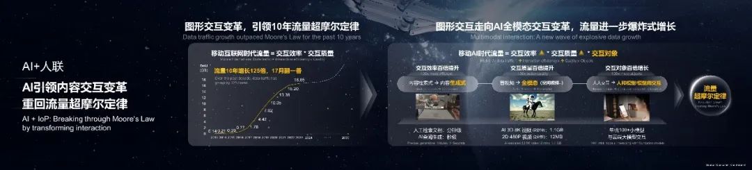 第一,圖形交互變革在過去10年推動了移動流量快速增長,DoU在過去十年增長120多倍,平均每17個月翻一番,流量增速超摩爾定律。我們認(rèn)為,移動AI時代將引領(lǐng)內(nèi)容交互的再次變革,隨著生成式內(nèi)容將會取代檢索式成為主流,交互效率百倍提升;隨著AIGC將推動3D、空間視頻等全模態(tài)內(nèi)容生產(chǎn),交互信息量百倍提升;隨著終端將內(nèi)置大量本地小模型與云端大模型實(shí)時協(xié)同,交互對象百倍提升。這將將促進(jìn)移動流量爆炸式增長,重回流量超摩爾定律。