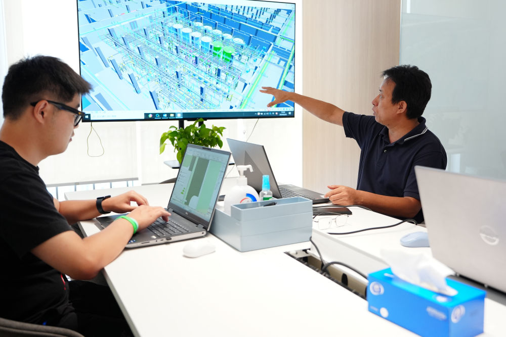 2024年8月26日,中國電子院工作人員利用數(shù)字孿生模型討論某半導(dǎo)體項目純水系統(tǒng)方案