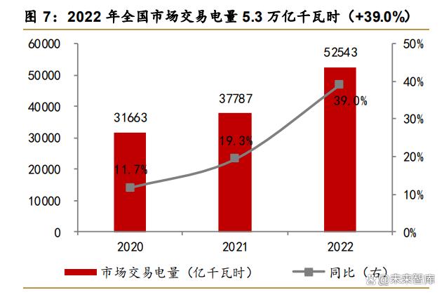 全國市場化交易電量占全社會用電量的比重逐年上升。新一輪電改實施以來,我國電力 市場建設(shè)穩(wěn)步有序推進(jìn),價格機制也愈加完善,市場化交易電量占全社會用電量的比重大幅 提升。2022 年全國市場交易電量約 5.3 萬億千瓦時,同比高增 39.0%,占全社會用電量比 重為 60.8%,較 2021 年提升 15.3pp。據(jù)中電聯(lián)《中國電力行業(yè)年度發(fā)展報告 2022》顯示, 截至 2021 年底,全國各電力交易中心累計注冊市場主體 46.7 萬家,數(shù)量較 2020 年增長 76.0%。電力市場化建設(shè)具備先進(jìn)性,一方面,市場化價格有利于充分反映電力市場真實供 需變化,煤價上漲等成本壓力通過更高電價傳導(dǎo)到下游的機制更順暢;另一方面,電力市場 化交易有利于實現(xiàn)電力資源在全國范圍內(nèi)的優(yōu)化配置,更好實現(xiàn)跨省跨區(qū)電力傳送。