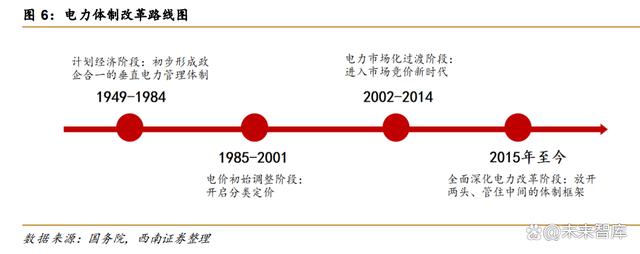 從我國電價政策機制發(fā)展歷程來看,我國電價政策機制發(fā)展歷程大致可以分成四個階段: 1)計劃經(jīng)濟(jì)階段(1949-1984 年):1950 年,我國成立電力行業(yè)管理局,初步形成以中央 領(lǐng)導(dǎo)為主、地方領(lǐng)導(dǎo)為補充的政企合一的垂直電力管理體制;2)電價初始調(diào)整階段 (1985-2001 年):1985 年,以國家經(jīng)濟(jì)委員會、國家計劃委員會、水利電力部、國家物價 局發(fā)布的《關(guān)于鼓勵集資辦電和實行多種電價的暫行規(guī)定》為標(biāo)志,開啟分類定價;3)電力 市場化過渡階段(2002-2014 年):2002 年國務(wù)院發(fā)布《電力體制改革方案》,標(biāo)志著我國 電力行業(yè)定價正式告別政府定價,進(jìn)入市場競價新時代。4)全面深化電力改革階段(2015 年至今):2015 年,中共中央國務(wù)院下發(fā)《關(guān)于進(jìn)一步深化電力體制改革的若干意見》(中發(fā) [2015]9 號),確定了“三放開、一獨立、三強化"的改革基本路徑以及"放開兩頭、管住中間" 的體制框架。 新一輪電力體制改革加速推進(jìn)。傳統(tǒng)電力系統(tǒng)調(diào)度模式為“源隨荷動”,根據(jù)用電側(cè)來 調(diào)整電源側(cè)的發(fā)電量,新型電力系統(tǒng)下電源側(cè)發(fā)電量和負(fù)荷側(cè)用電量均不可控,加大了電力 調(diào)度難度。而目前電網(wǎng)調(diào)度方式主要是面向常規(guī)電源為主的計劃調(diào)度機制,電力體制改革隨 之深化。