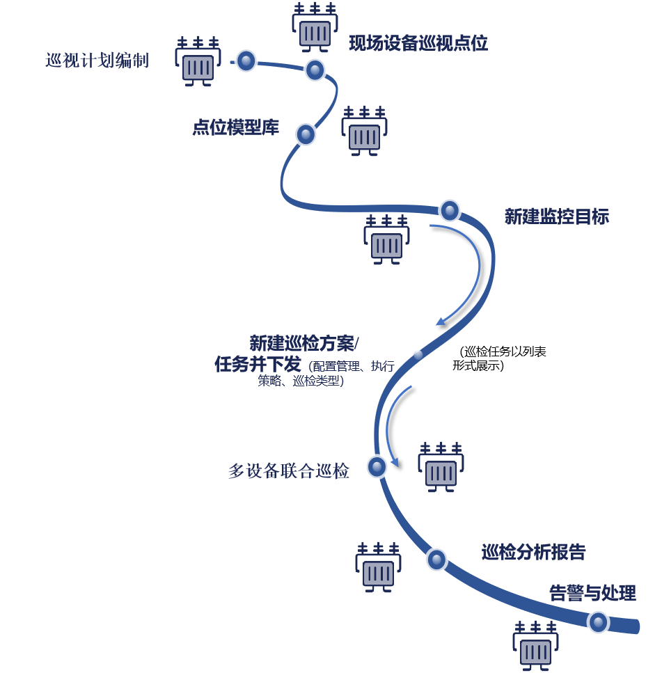 同時,針對變電站內(nèi)攝像機(jī)、機(jī)器人、無人機(jī)、在線監(jiān)測等多種感知及智能巡視設(shè)備間缺乏聯(lián)動機(jī)制現(xiàn)象,江行智能開發(fā)變電遠(yuǎn)程智能巡視系統(tǒng),可將上述多種智能巡視設(shè)備納入系統(tǒng)管控,并設(shè)計聯(lián)合巡檢策略,最大程度挖掘智能設(shè)備價值,提升設(shè)備利用率及巡視作業(yè)智能化水平。