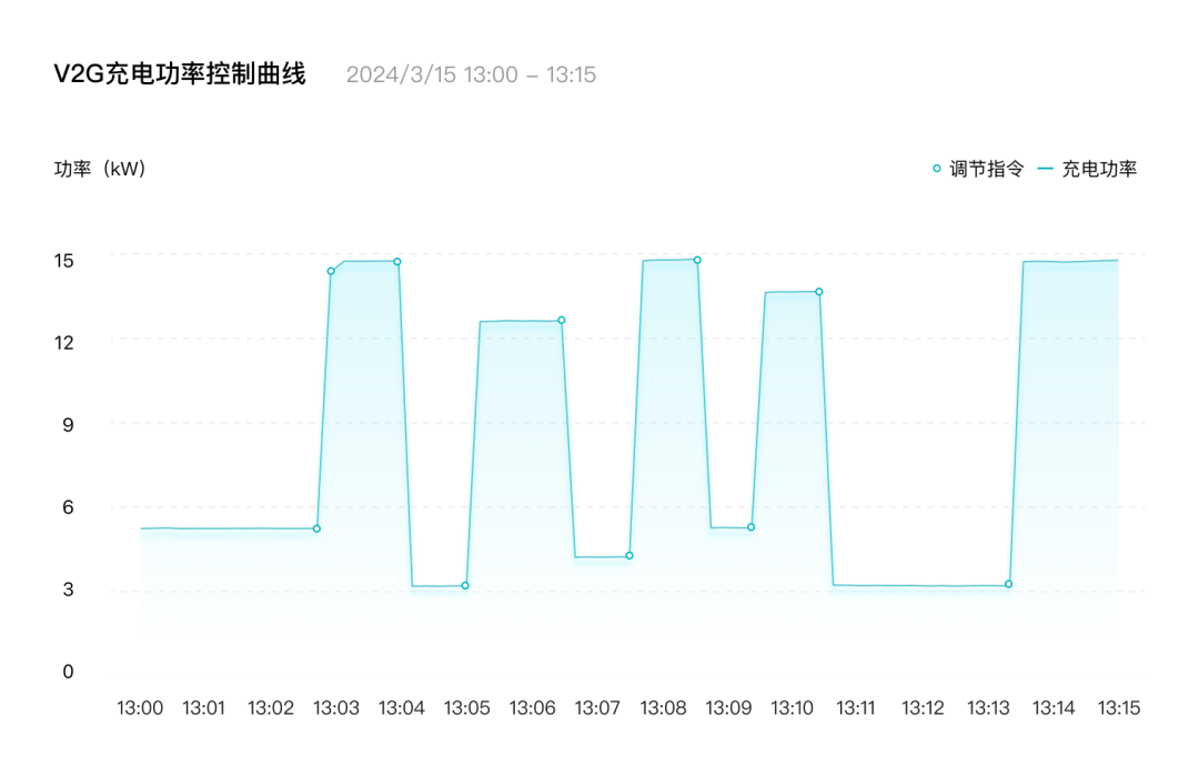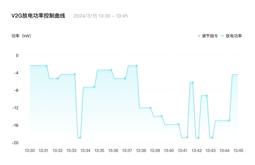 本次試驗(yàn)設(shè)備采用廣汽能源20kW一體式V2G充電樁及昊鉑HT車型,試驗(yàn)中,廣汽能源智慧管理云平臺(tái)模擬接收電網(wǎng)調(diào)控中心(虛擬電廠)的調(diào)頻指令,然后通過(guò)ADR技術(shù)連續(xù)15分鐘自動(dòng)控制V2G充電及放電功率,秒級(jí)響應(yīng)虛擬電廠的調(diào)頻需求。
