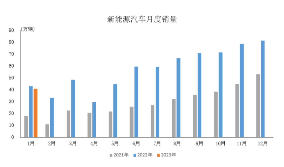 2023年1月,新能源汽車產(chǎn)銷分別完成42.5萬輛和40.8萬輛,環(huán)比分別下降46.6%和49.9%,同比分別下降6.9%和6.3%,市場占有率達(dá)到24.7%。與2022年春節(jié)月(2月份)相比,產(chǎn)銷分別增長15.4%和22.2%。