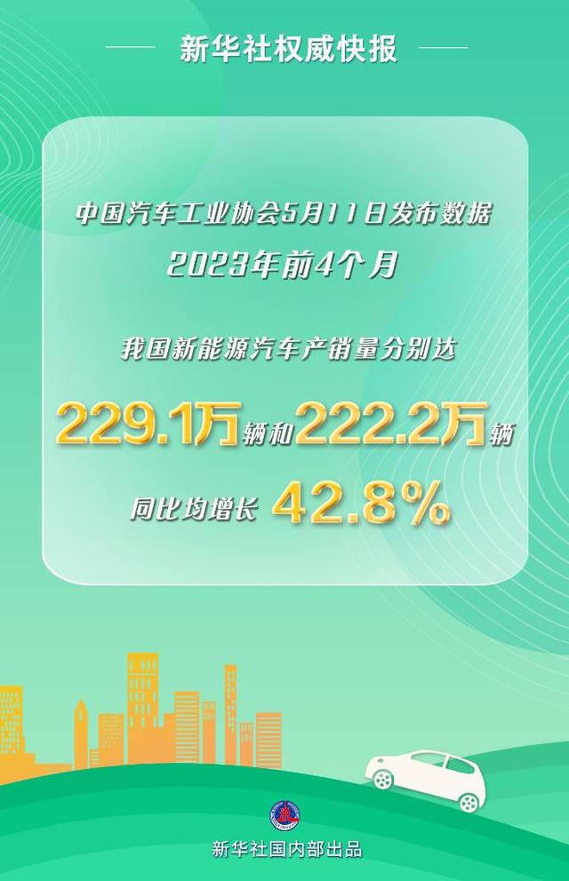 中國汽車工業(yè)協(xié)會5月11日發(fā)布數(shù)據(jù)顯示,2023年前4個月我國新能源汽車產(chǎn)銷量分別達229.1萬輛和222.2萬輛,同比均增長42.8%。