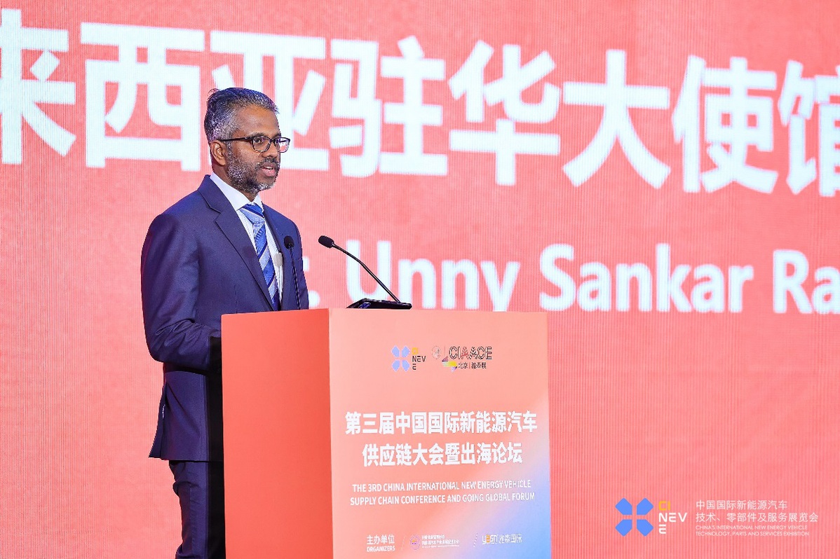 國(guó)家信息中心正高級(jí)經(jīng)濟(jì)師徐長(zhǎng)明先生發(fā)言國(guó)際合作展望:共探出海廣闊前景新能源汽車產(chǎn)業(yè)全球化趨勢(shì)日益明顯,國(guó)際合作與出海發(fā)展成為企業(yè)拓展市場(chǎng)、提升競(jìng)爭(zhēng)力的重要途徑。本環(huán)節(jié)旨在為國(guó)內(nèi)外企業(yè)搭建溝通橋梁,來(lái)自7個(gè)國(guó)家的駐華使節(jié)分享各國(guó)新能源汽車產(chǎn)業(yè)的市場(chǎng)機(jī)遇與優(yōu)惠政策,為中國(guó)企業(yè) “走出去” 提供精準(zhǔn)信息,同時(shí)幫助國(guó)外企業(yè)尋求合作,促進(jìn)資源共享與技術(shù)交流,攜手開(kāi)拓全球市場(chǎng),實(shí)現(xiàn)互利共贏,提升中國(guó)新能源汽車產(chǎn)業(yè)的國(guó)際地位。出海政策:馬來(lái)西亞馬來(lái)西亞駐華大使館經(jīng)濟(jì)公使Unny Sankar Ravi Sankar先生發(fā)表演講。他高度認(rèn)可中國(guó)在新能源汽車行業(yè)的全球領(lǐng)導(dǎo)地位,期望中國(guó)能與馬來(lái)西亞中小企業(yè)分享技術(shù),共同開(kāi)發(fā)前沿技術(shù),實(shí)現(xiàn)互利共贏。他提到,“一帶一路”