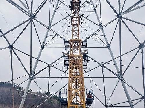 中國電力網(wǎng)訊 12月7日,在湖北紅安縣杏花鄉(xiāng),湖北送變電公司駐馬店一武漢1000千伏特高壓線路工程(6)標(3S219號)組塔施工現(xiàn)場, 項目工人正在進行抱桿拆卸施工作業(yè)。(劉偉康、郭暉)