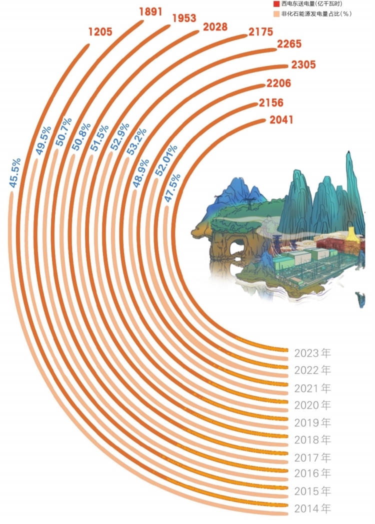 2014—2023年,南方五省區(qū)非化石能源發(fā)電量增長4272億千瓦時,達到7685億千瓦,年平均增長率達到9%,發(fā)電量占比增長到48%,高于全國平均水平13.7個百分點。南方電網(wǎng)系統(tǒng)調(diào)節(jié)能力顯著提升,為能源結(jié)構(gòu)綠色低碳轉(zhuǎn)型奠定堅實基礎(chǔ)。