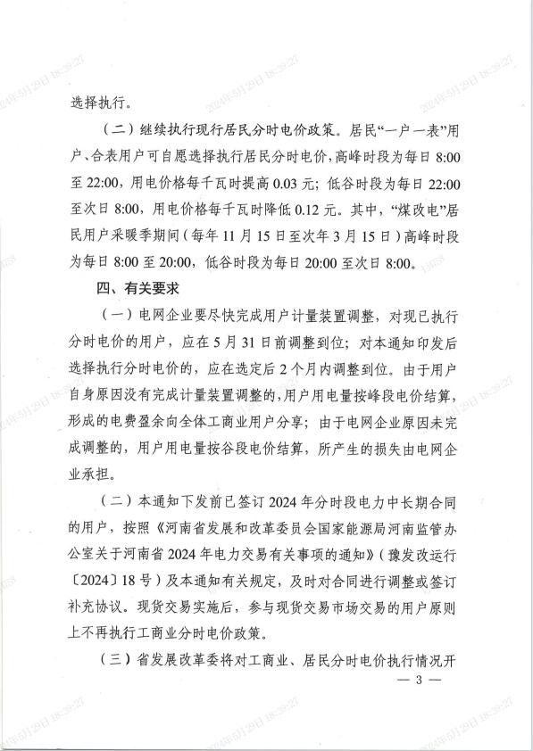 (二)本通知下發(fā)前已簽訂2024年分時段電力中長期合同的用戶,按照《河南省發(fā)展和改革委員會國家能源局河南監(jiān)管辦公室關(guān)于河南省2024年電力交易有關(guān)事項的通知》(豫發(fā)改運行〔2024〕18號)及本通知有關(guān)規(guī)定,及時對合同進行調(diào)整或簽訂補充協(xié)議。現(xiàn)貨交易實施后,參與現(xiàn)貨交易市場交易的用戶原則上不再執(zhí)行工商業(yè)分時電價政策。