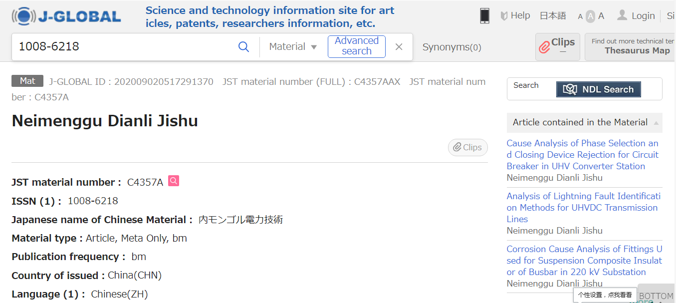 《內(nèi)蒙古電力技術(shù)》首次被國際知名數(shù)據(jù)庫JST收錄