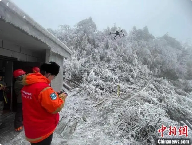 晉電援湘抗冰突擊隊(duì)隊(duì)員利用無人機(jī)觀察冰情。國網(wǎng)山西省電力公司供圖