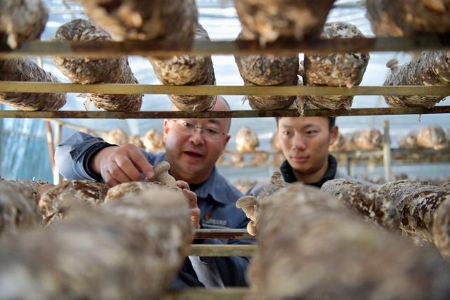 貴州安順供電局派駐安順市紫云自治縣洛麥村駐村第一書(shū)記王維鐸和農(nóng)戶(hù)在查看香菇長(zhǎng)勢(shì)。陳娟攝