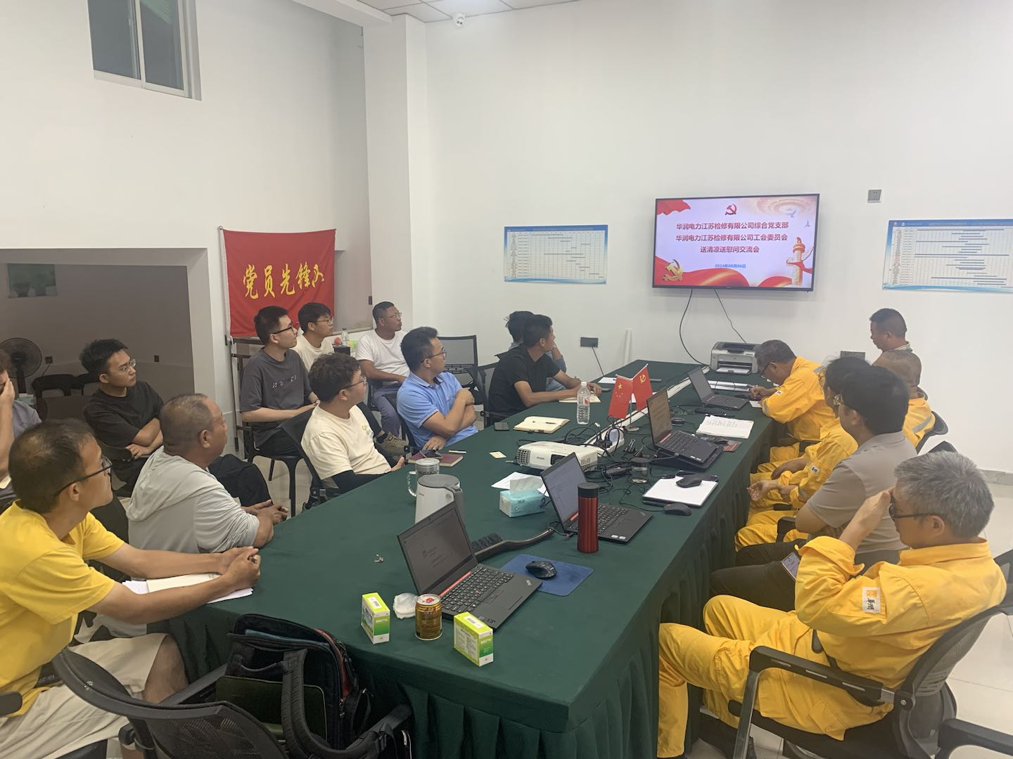 在本次送清涼活動(dòng)中,黨支部成員結(jié)合生產(chǎn)工作,也準(zhǔn)備了針對(duì)建設(shè)項(xiàng)目的法律法規(guī)等課件,對(duì)清江浦建設(shè)項(xiàng)目所有參建單位的管理人員共 16 人,開(kāi)展了光伏建設(shè)項(xiàng)目相關(guān)知識(shí)的培訓(xùn)及測(cè)試。培訓(xùn)結(jié)束后,并對(duì)施工現(xiàn)場(chǎng)進(jìn)行了相關(guān)安全檢查,重點(diǎn)檢查了升壓站區(qū)域施工現(xiàn)場(chǎng)的安全防護(hù)措施、個(gè)人防護(hù)裝備以及施工現(xiàn)場(chǎng)的安全管理狀況,確保每一項(xiàng)安全規(guī)定都能被嚴(yán)格遵守。同時(shí),還對(duì)工程進(jìn)度予以了評(píng)估,給出了具有建設(shè)性的意見(jiàn)和建議。