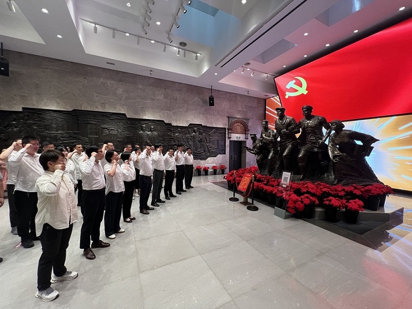 在紀(jì)念館內(nèi),上海公司黨員干部沿著歷史脈絡(luò),通過多媒體互動技術(shù)身臨其境地感受了1925年中共四大召開的生動場景,一件件珍貴的館藏文物、一幅幅生動的歷史圖片、一段段詳實的文字記錄,全方位展現(xiàn)了中共四大在黨的歷史上的重要意義。在黨旗下,全體黨員佩戴黨徽,舉起右拳,一起重溫入黨誓詞,用發(fā)自內(nèi)心的聲音表達(dá)對黨的絕對忠誠,共同說出為共產(chǎn)主義奮斗終身的鏗鏘誓言。