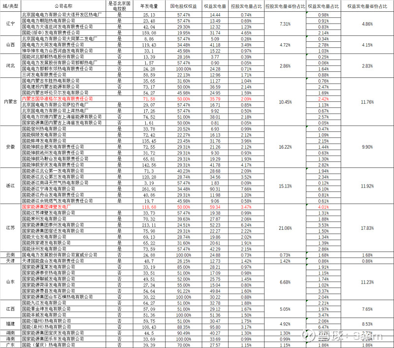 國(guó)電的火電有一些明顯的特點(diǎn),就是控股火電發(fā)電量多,權(quán)益相對(duì)低,也有人質(zhì)疑國(guó)電的火電資產(chǎn)差,位置不好。那么國(guó)電的火電到底分布如何呢,經(jīng)過(guò)一個(gè)個(gè)的股權(quán)查詢(紅色兩家還沒(méi)查到用50%替代,后續(xù)翻報(bào)表后更新),按照2022年全年剝離寧夏火電后的數(shù)據(jù),我做了統(tǒng)計(jì)和分析。大家可以看結(jié)論,到底如何大家自己判斷。$國(guó)電電力(SH600795)$ $大唐發(fā)電(00991)$ $華電國(guó)際(SH600027)$ 華能?chē)?guó)際