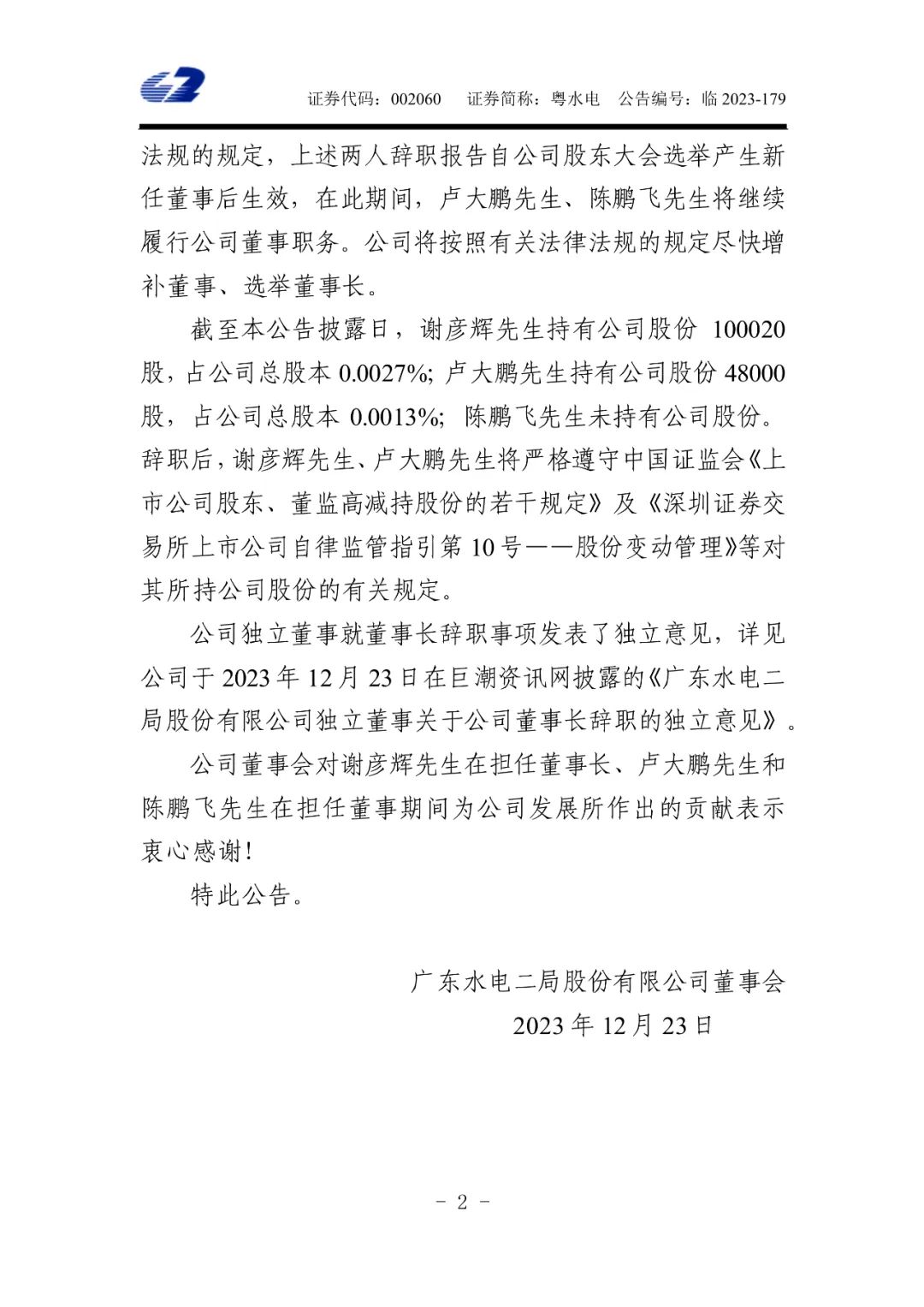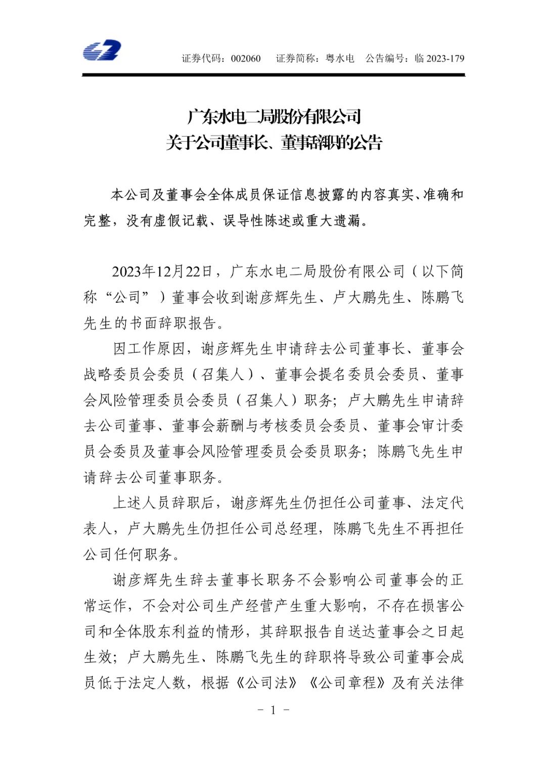12月23日,粵水電發(fā)布公告稱,因工作原因,謝彥輝申請辭去公司董事長、董事會戰(zhàn)略委員會委員(召集人)、董事會提名委員會委員、董事會風險管理委員會委員(召集人)職務;盧大鵬申請辭去公司董事、董事會薪酬與考核委員會委員、董事會審計委員會委員及董事會風險管理委員會委員職務;陳鵬飛申請辭去公司董事職務。