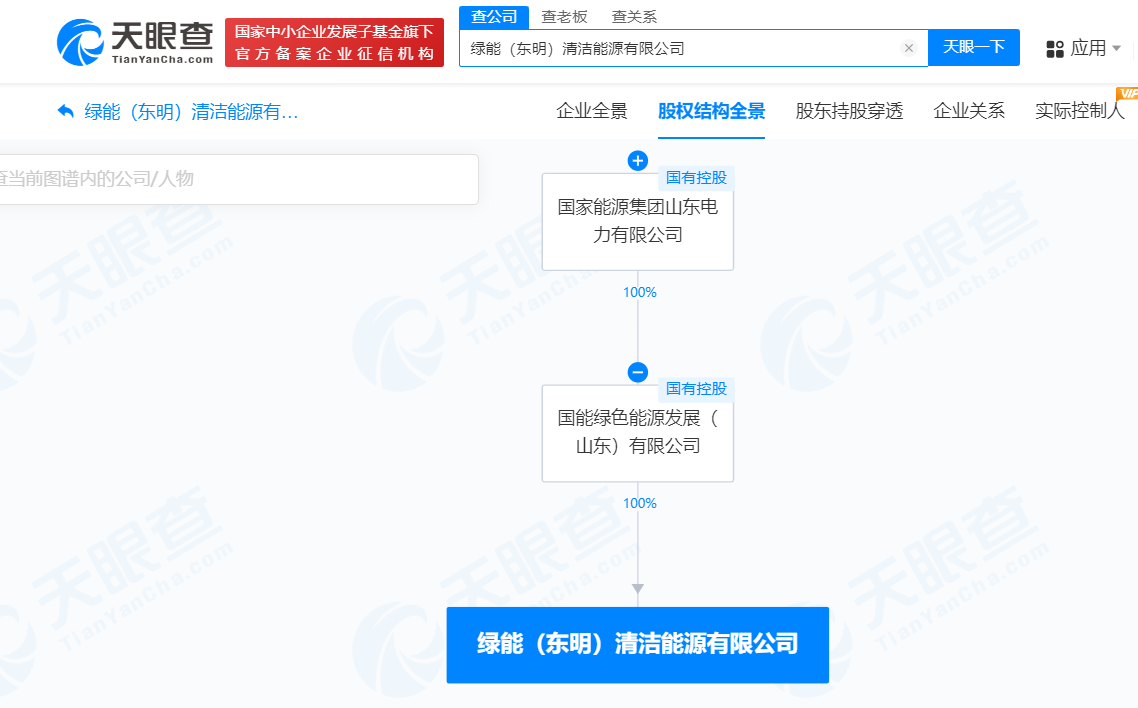 股權全景穿透圖顯示,該公司由國能綠色能源發(fā)展(山東)有限公司全資持股,后者由國電電力間接全資持股。