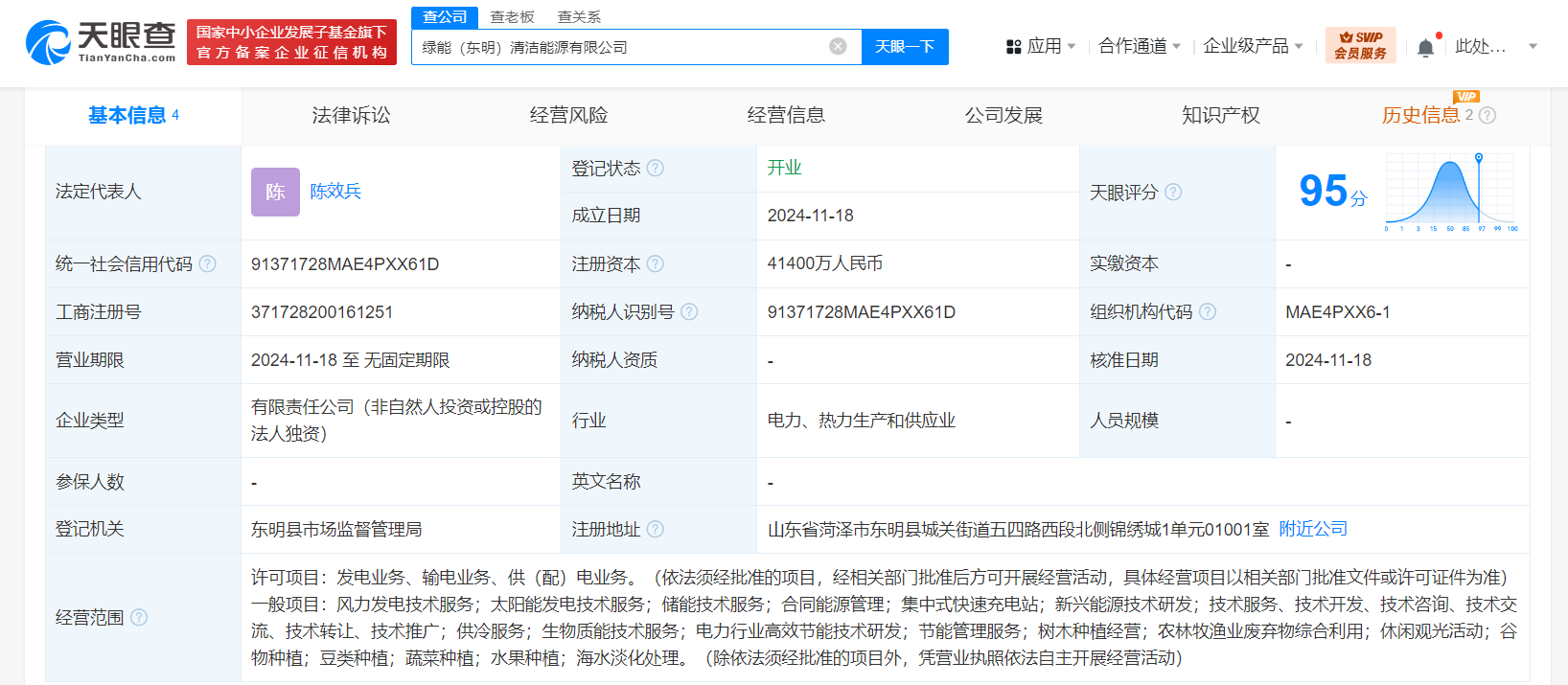 天眼查App顯示,近日,綠能(東明)清潔能源有限公司成立,法定代表人為陳效兵,注冊資本4.14億元,經(jīng)營范圍含發(fā)電業(yè)務、輸電業(yè)務、供(配)電業(yè)務,風力發(fā)電技術服務,太陽能發(fā)電技術服務,儲能技術服務,集中式快速充電站,新興能源技術研發(fā)等。